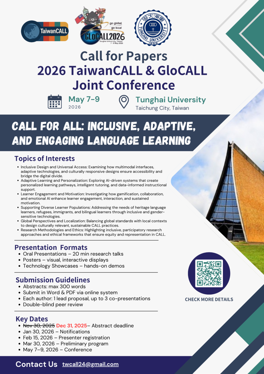 This international conference is dedicated to bringing together leading voices in Computer-Assisted Language Learning (CALL). Our primary focus is on exploring the evolving landscape of CALL and the emerging technologies in language education. We warmly welcome researchers, educators, and practitioners to share their latest work and insights.